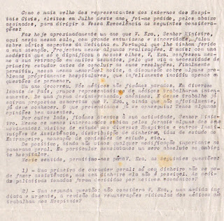 O livro do Mário Neves  -  "A Saúde, as Políticas e o Neoliberalismo" - refere uma intervenção que fiz, em nome dos Internos dos HCL, na sessão inaugural da Sociedade Médica dos Hospitais Civis, em 1959. Há tempos a Rita mostrou interesse em conhecer o teor da intervenção. Encontrei na minha "papelada" uma cópia do que li nessa sessão, com grande espanto do chamado "Corpo Clínico -  Assistentes  e Directores"...