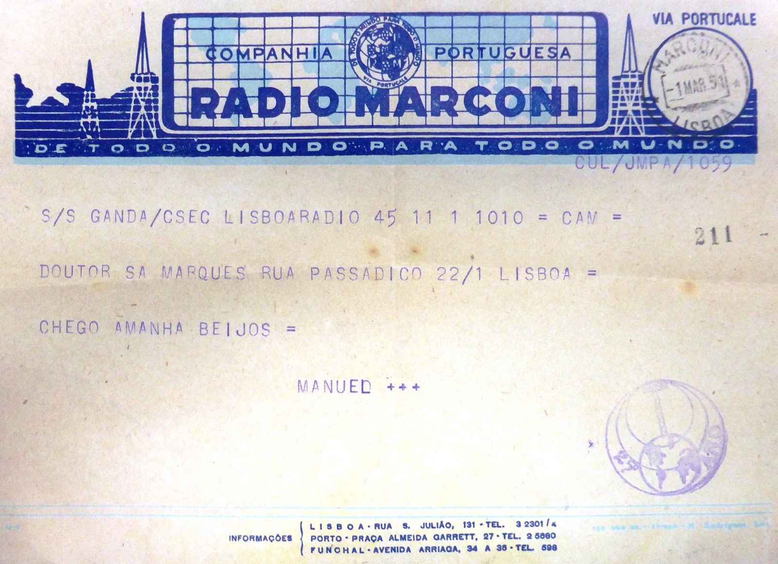 9-03 para Lisboa onde entrou pela primeira vez a 12-03-1948. Registado em